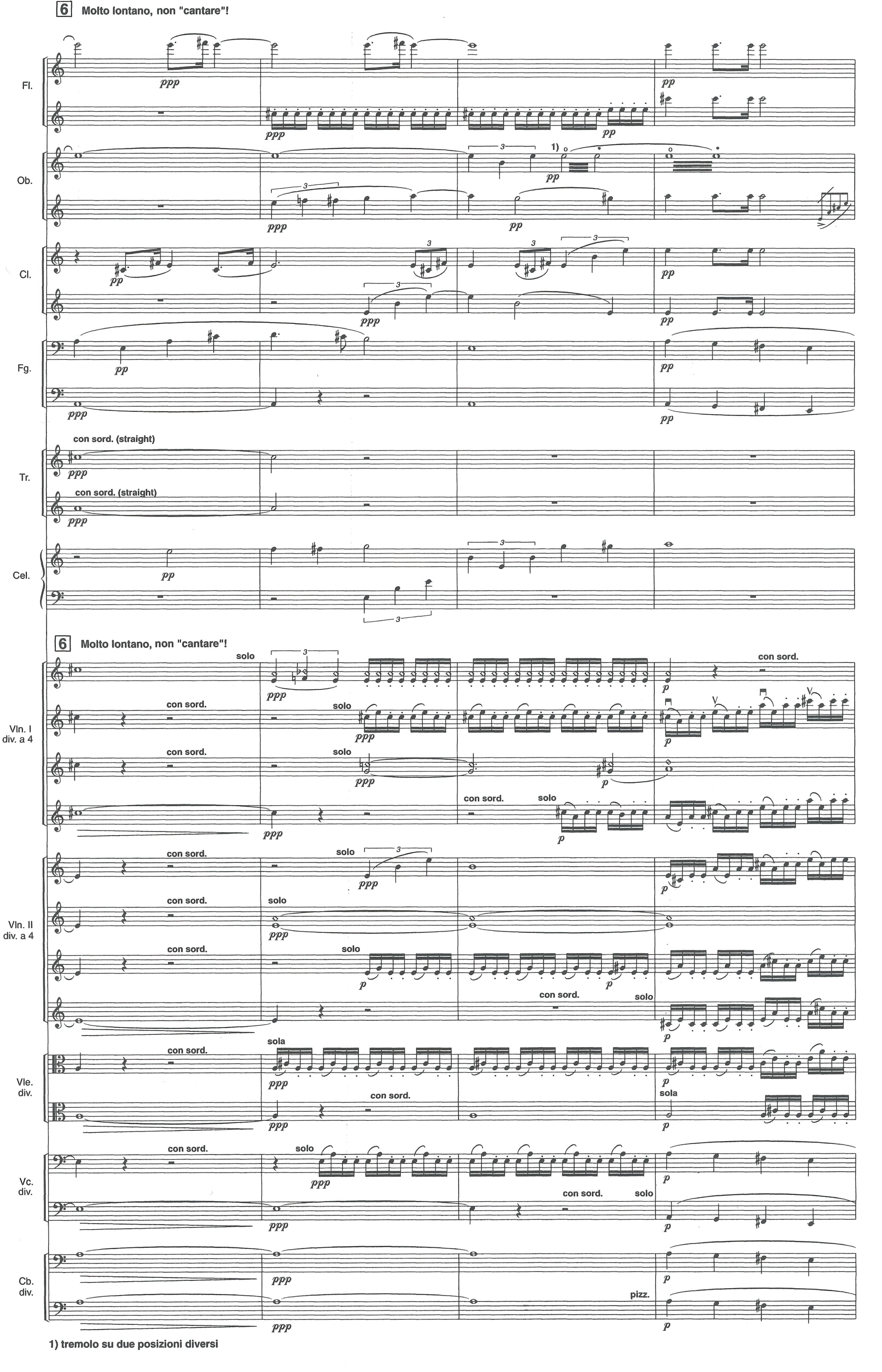 Some of these interjections of the connecting tissue intertwine fragments of late Schubert works, such as the Piano Sonata in B flat major (D960), the Piano Trio in B flat major (D898), as well as some songs of Winterreise.* A lengthy analysis of Renderings including a longer description around Schubert’s original material and its transformation can be found in Thomas Gartmann, ""... dass nichts an sich jemals vollendet ist" : Untersuchungen zum Instrumentalschaffen von Luciano Berio," Publikationen der Schweizerischen Musikforschenden Gesellschaft. Serie 2 37 (1995), https://doi.org/10.5169/seals-858818 For example, the fragment below shows some abbreviated quotations of the main theme from the Piano Sonata in B-flat major. The first oboe, trumpet and clarinet play the first three notes before diverging. Soon after, the first oboe diminishes the rhythm. The violins play the motive as repeated sixteen-notes. Finally, the celesta presents the first phrase of the theme in its literal melodic form, without harmony, doubled by the second violins.