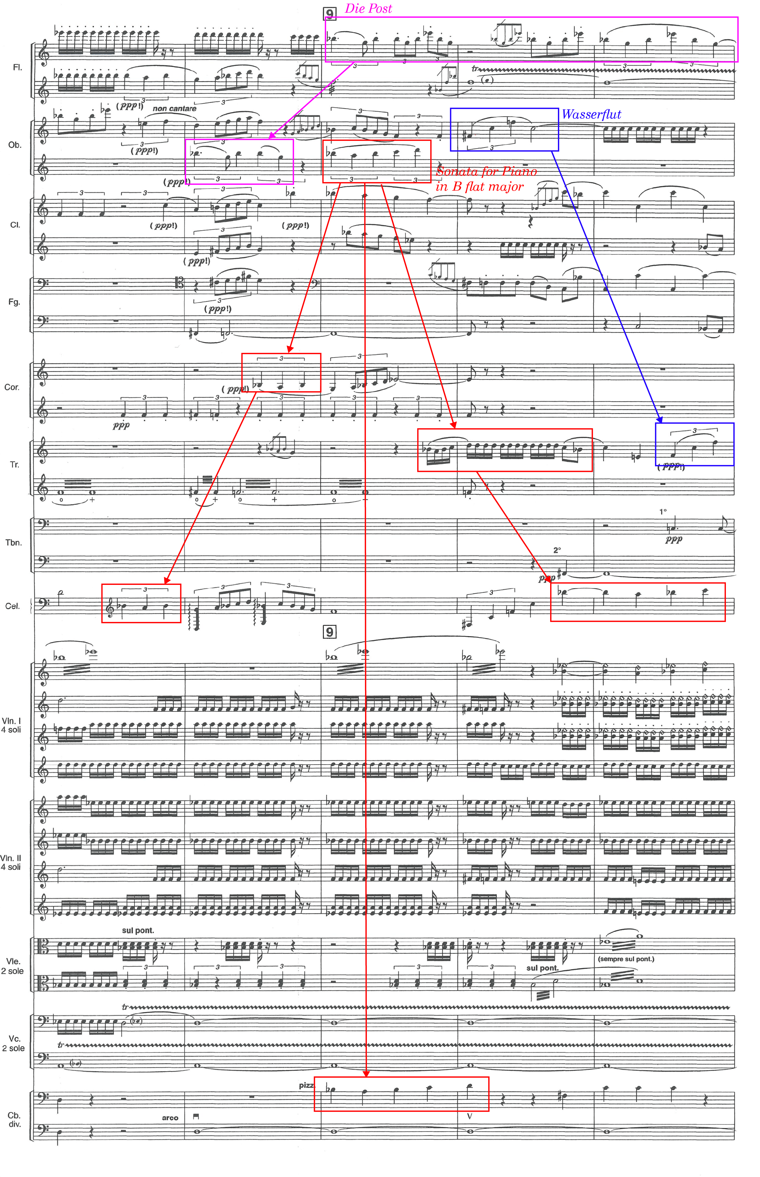In Rendering, some references to Winterreise can be observed. For instance, the beginning of “Wasserflut” (the sixth song of the cycle), characterized by its intervals (ascending perfect fifth, ascending and descending perfect fourth), is rhythmically condensed here into a succession of three appoggiaturas followed by a long note, as it can be seen in the score above, in the first trumpet and first clarinet (here the quotation to “Wasserflut” overlaps with a quotation to the Piano Sonata in B flat major). Later, the first oboe and first trumpet play an rhythmically augmented version of the same motive. Additionally, there is a reference to “Die Post” (the thirteenth song) in the first flute at rehearsal mark 9, featuring its characteristic broken chord and triplet rhythmic feel, as shown below: