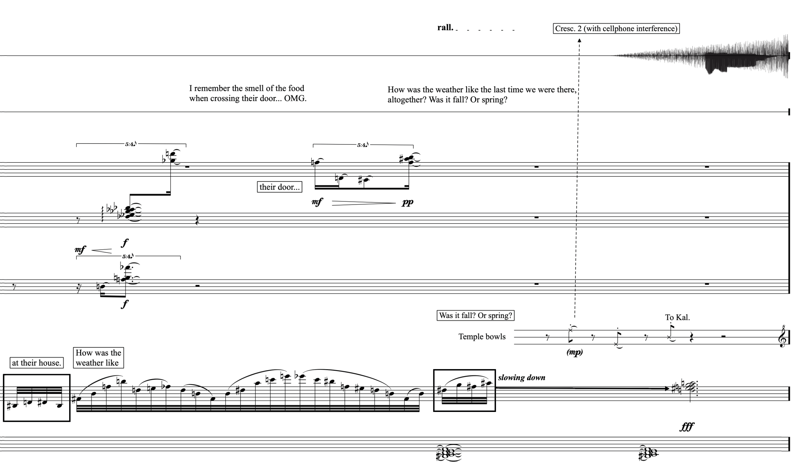 An example of the opposite process is Oscillations (ii). There, quotations from the original drive the narrative, and these materials become characters that interact with other new elements, perhaps clashing or establishing a co-existence but essentially fading into each other or emerging. Somehow, connected to Berio’s idea in Rendering. Finally, in Oscillations (iii), the historical materials shift away from their original form and then return to it, a process that repeats back and forth throughout the sections. Additionally, the narrated part mirrors this transformation through a mental drifting, using the original verses of the poem –translated into English– as its point of departure.