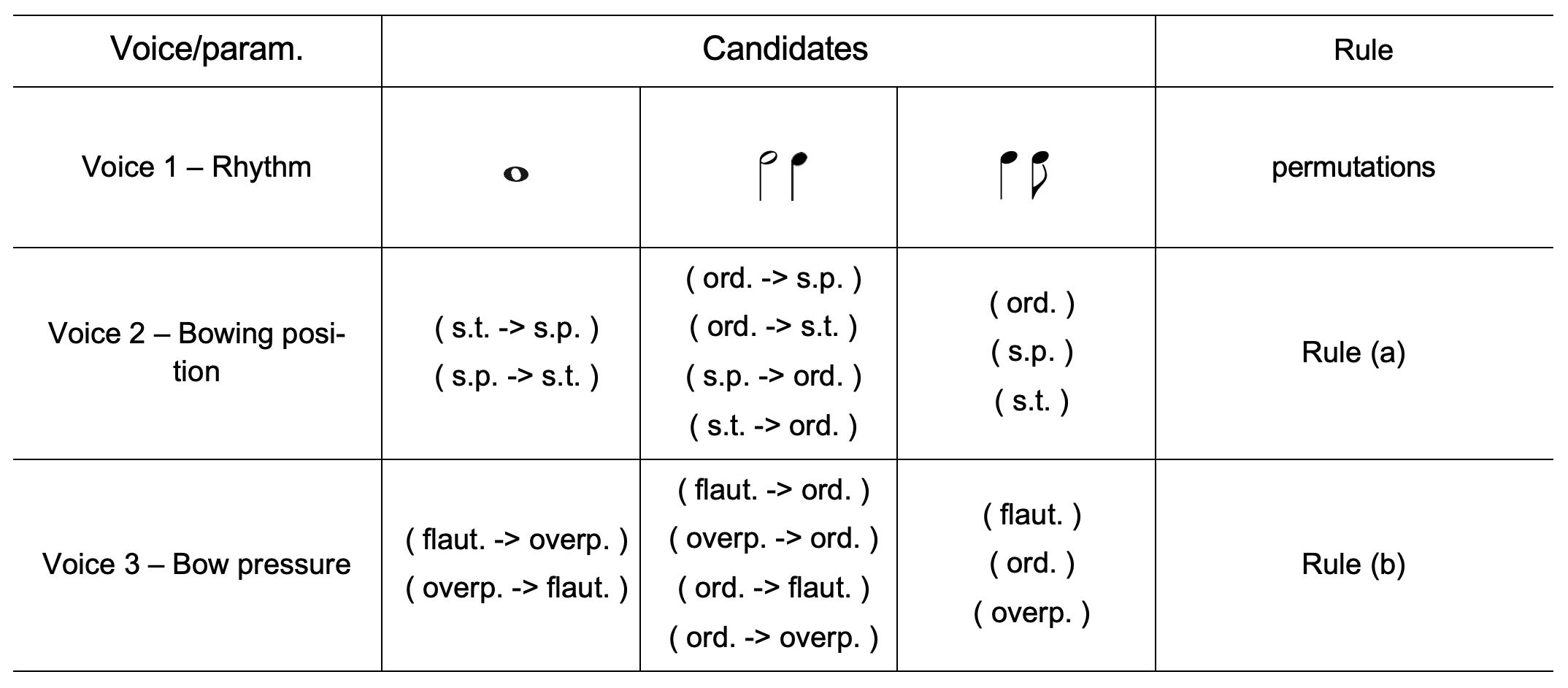Notice how rule (a) observes that in each list, only two elements repeat, and the rest are different. In the second rule (b), only two elements are repeated across consecutive lists, and within each list, the rest of the elements are different. As an example, consider the bowing position. Here the candidates have been restricted to ordinario (‘ord.’), sul ponticello (‘sul pont.’), sul tasto (‘sul tasto’), and the possible trajectories between them. The rule, thus, enforces that two bowing positions should be repeated every consecutive four.