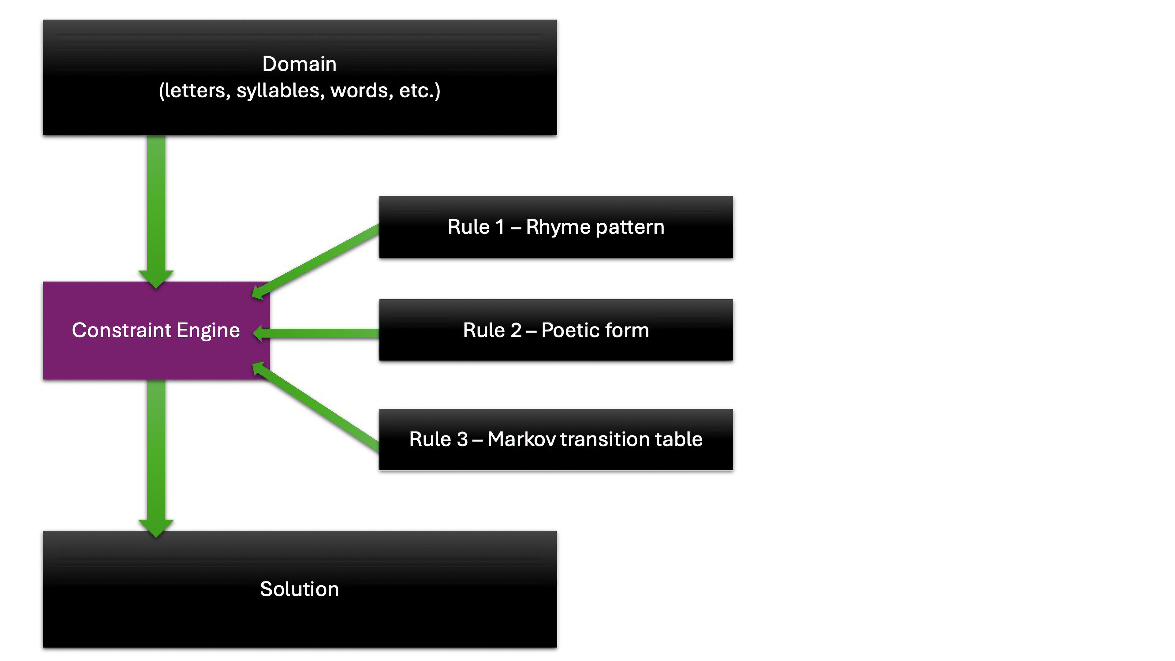 In the following example, I created five shorter words using the same rules discussed above, but I added a rule that constrains the text output to have a determined ending rhyme pattern (abab). The time that took the algorithm to find solutions became considerably longer: