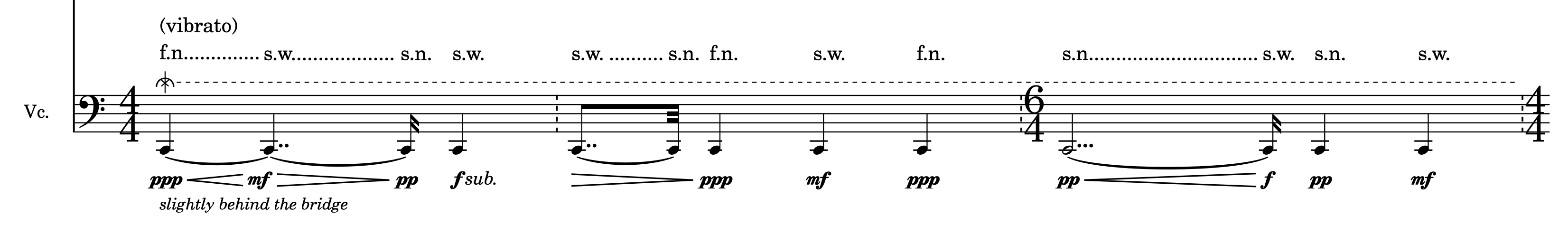 Anyway, to address these problems, I took up the cello and started playing the piece myself. I am not a trained cellist, and of course, some sections of the piece required highly developed technical skills. However, those presented fewer compositional problems. In essence, my strategy was to test these playing techniques, whether it was possible to smoothly transit between them, whether these transitions would have some noticeable effect on the sound, and whether this could be done at a relatively steady pace. This became a rather physical approach, strongly connected to the production process of the cello and my physical capacities. In addition, and importantly, I tried to maintain a strong “predictive” approach in terms of how these embodied experiences would extrapolate to other performers.