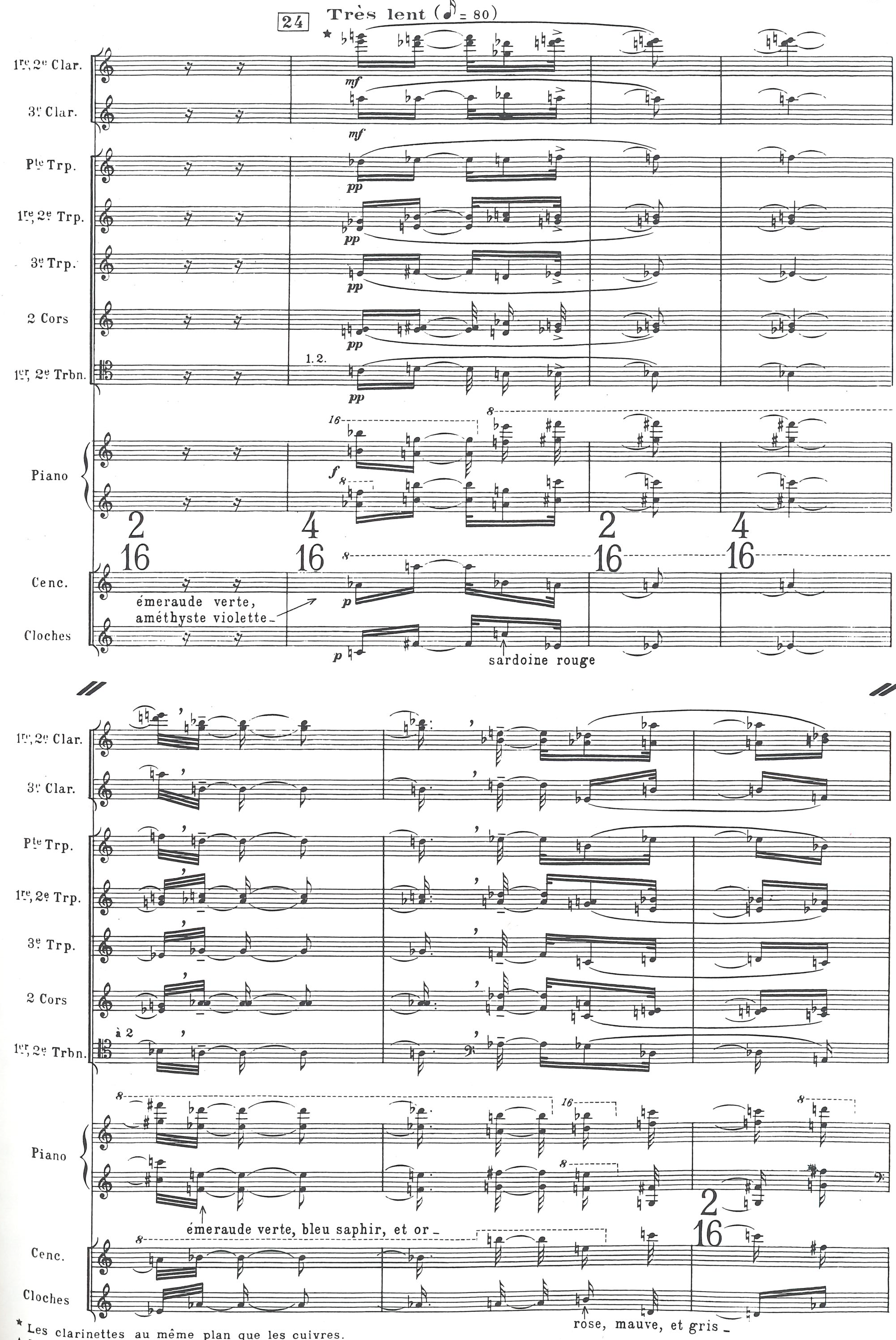 “The form of this work depends entirely on colors. The melodic or rhythmic themes, the combinations of sounds and timbres, evolve in the manner of colors. In their perpetually renewed variations, one can find (by analogy) warm and cool colors, complementary colors influencing their neighbors, colors fading toward white, or subdued by black. These transformations can also be compared to characters acting on several overlapping stages, simultaneously unfolding multiple different stories.”