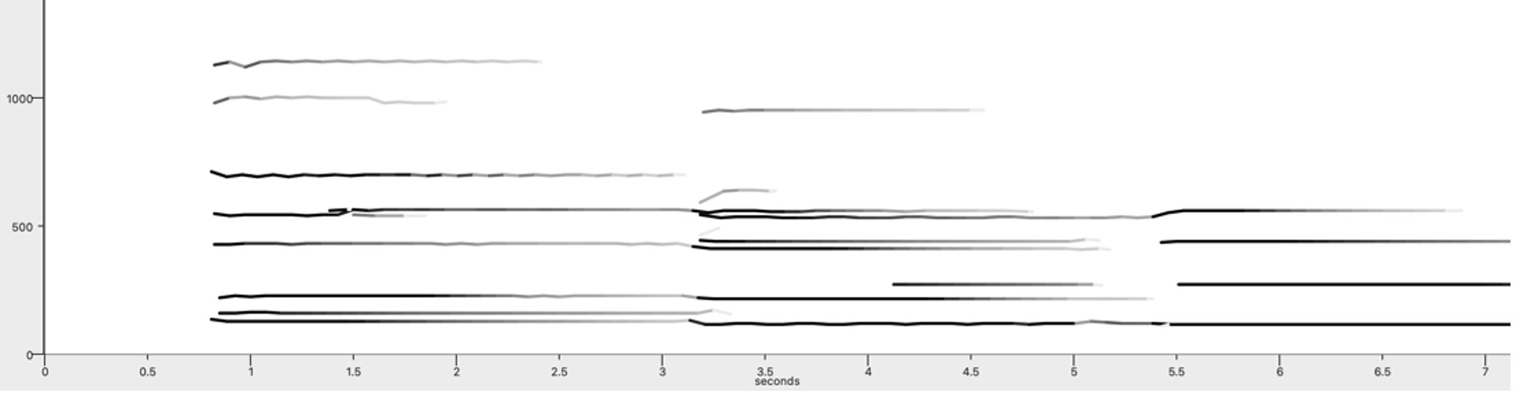 Another example of symbolic sonification of speech was already discussed in the piece Elevator Pitch for cello and electronics. Here, the musical material comes from sonifying Donald Trump’s spoken phrase, “The time for empty talk is over.” This approach is relatively similar to Harvey’s and Ciardi’s, namely, using an FFT analysis of the sound to identify the most salient spectral cues. In this case, I discarded the information on formants and maintained only the fundamental frequency. This was later translated from an SDIF*SDIF, "Sound Description Interchange Format," is a standard for the codification and interchange of a variety of sound descriptions. SDIF was jointly developed by IRCAM and CNMAT. file into a roll-type notation system and later quantized.