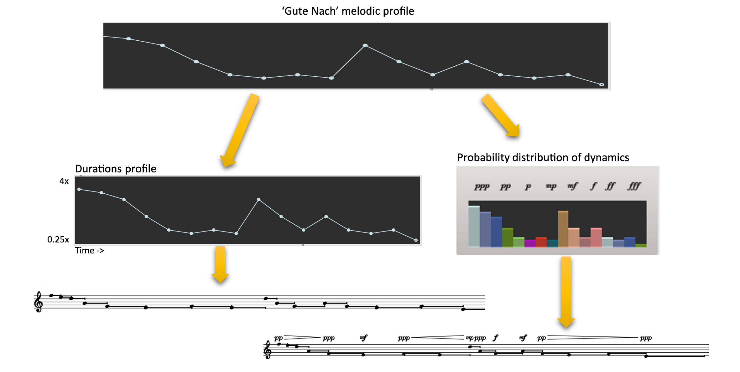 An example of this can be found in my piece Oscillations (i). Here, I use a melodic profile to reconstruct a rhythmic profile and a probabilistic dynamic distribution profile. In this case, the melodic profile is expressed as a break-point function (BPF) and becomes the source of new remappings of this BPF across diverse musical dimensions.