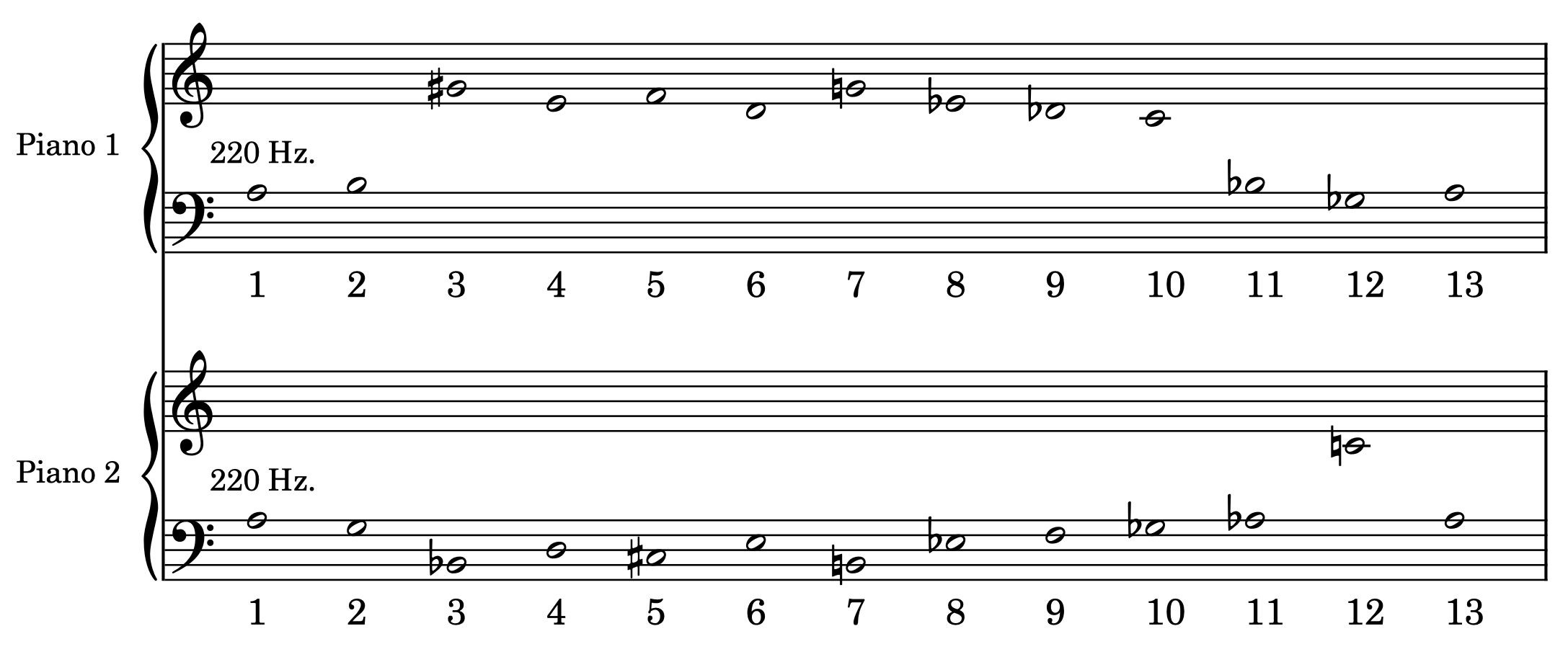 An example of symbolic sonification closely tied to the concept of instrumental resynthesis of acoustic sounds in my work is found in the piece Oscillations (iii). In this piece, the piano chords serve as an instrumental resynthesis of the harmonic spectrum of a bell-like sound produced by a prepared C2 note on the same piano. The preparation is relatively simple, achieved by placing two magnets near the tuning pegs. Since the bell-like sound reappears throughout the piece, the chords may be perceptually connected to it. However, upon listening, this connection does not stand out or become perceptually apparent –especially if the listener is unaware of it beforehand. This process is shown in the image below. The rhythmic part has been slightly modified “by hand” from the original quantization.