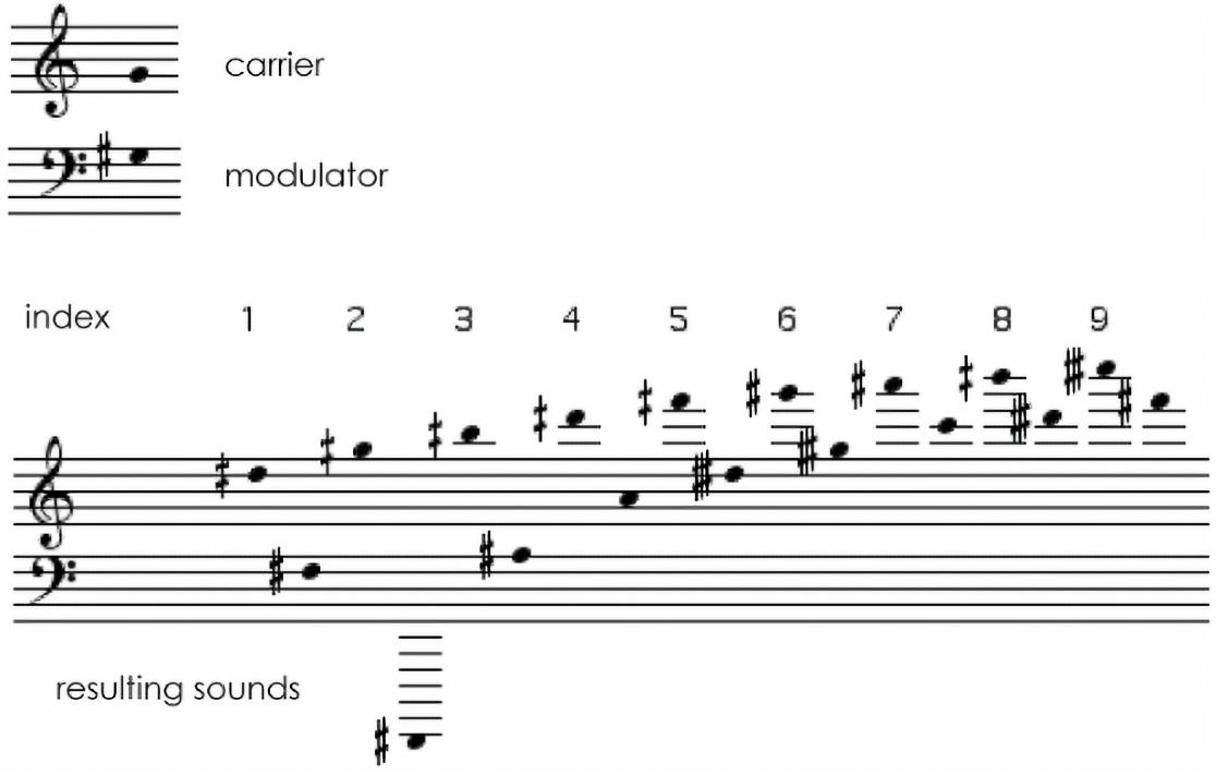 Not limited to the resynthesis of acoustic spectrums, the French spectralists investigated the possibility of instrumentally resynthesizing artificial sound spectrums, as well as the development of more advanced techniques of synthesis and digital signal processing. For example, spectrums that resulted from different types of modulation of signals, such as frequency modulation (FM)*Frequency Modulation synthesis (FM) is a method of sound synthesis in which the frequency of a waveform is modulated by another signal. FM synthesis can produce both harmonic and inharmonic sounds. Harmonic sounds arise when the modulator is harmonically related to the carrier, while inharmonic, bell-like, or percussive tones are created using modulators with non-integer frequency ratios. A modulation index can be adjusted to add more complexity to the sound. Complex FM spectrums have a bell-like quality. or ring modulation (RM).*Ring Modulation synthesis (RM) is a type of signal processing function resulting in an output signal generated usually from the combination of two signals: a carrier signal and a modulator signal. The outcome of the ring modulation process is an output signal constituting the sum and the subtraction of those two signals. These output frequencies are called sidebands.