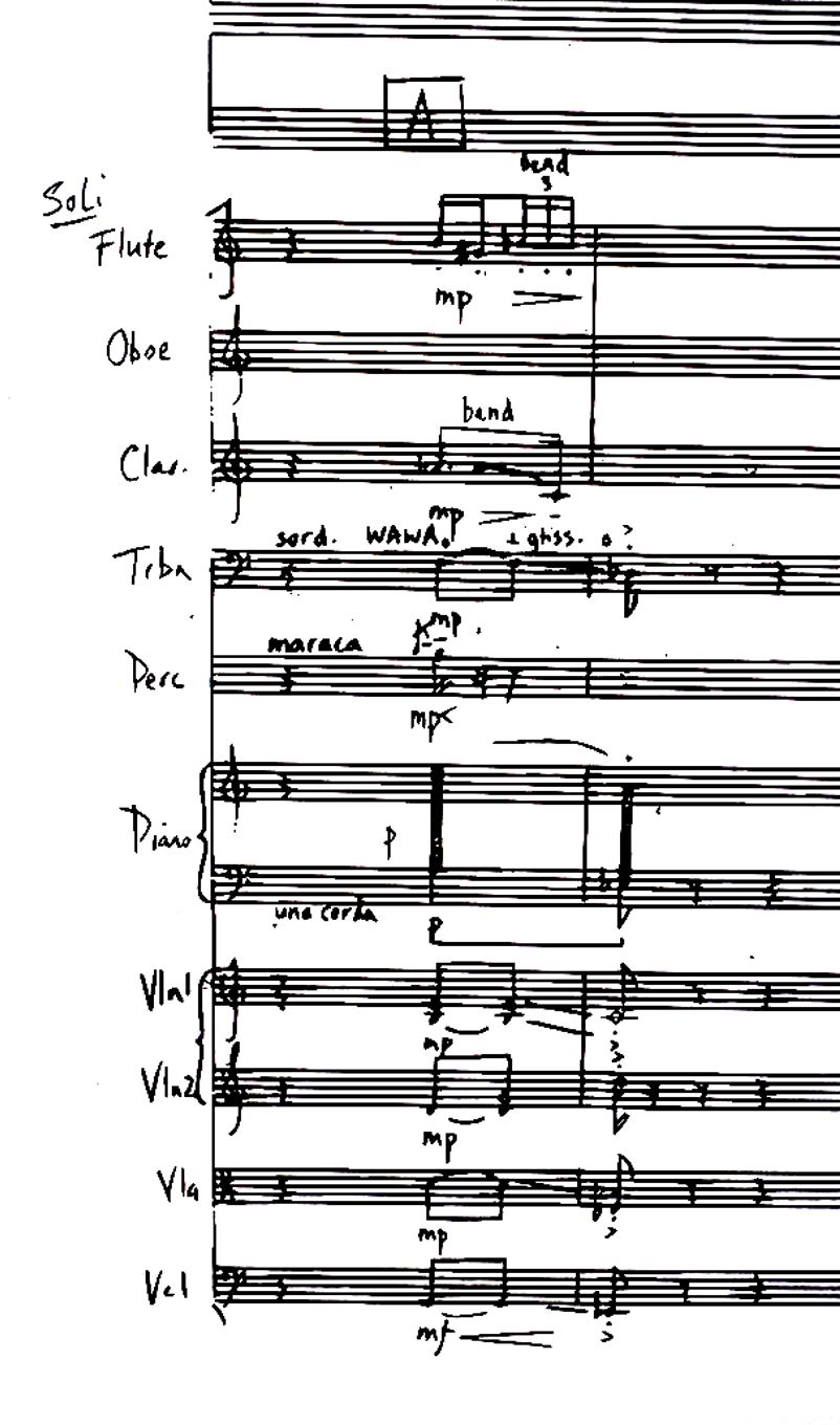 An example of the second process can be observed on p. 24 of the score, where the clusters in the piano are processed using a resonant filter that emphasizes or attenuates certain spectral bands in the sound simulating speech formants. This makes the sounds approach timbrally to speech.