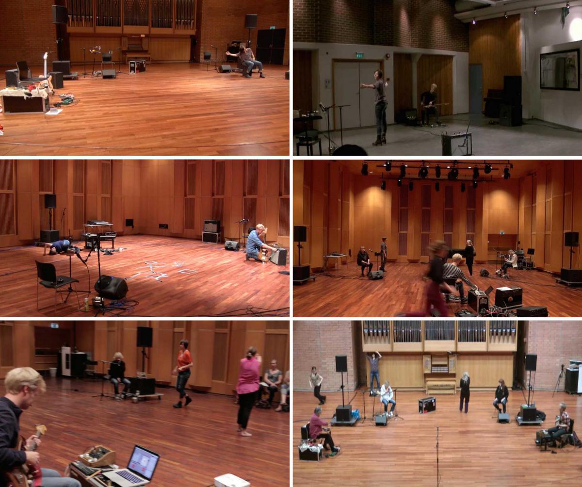 Fordi musikerne stor sett har vaert stasjonaere, har vi arbeidet mye med hvordan de skal plassere seg i rommet. Musikerne har ofte sittet spredt utover, for a kunne se og hore hverandre og seg selv i monitorer. Deres plasseringer avgrenser og apner nye rom i rommet, som er ganske annerledes enn for en danser a relatere seg til enn et apent scenerom. Ofte har det tydeligste feltet blitt en sirkel foran musikerne – som en liten dansemanesje – et vanskelig rom: som om her forventes en solo! (Se bilder.)