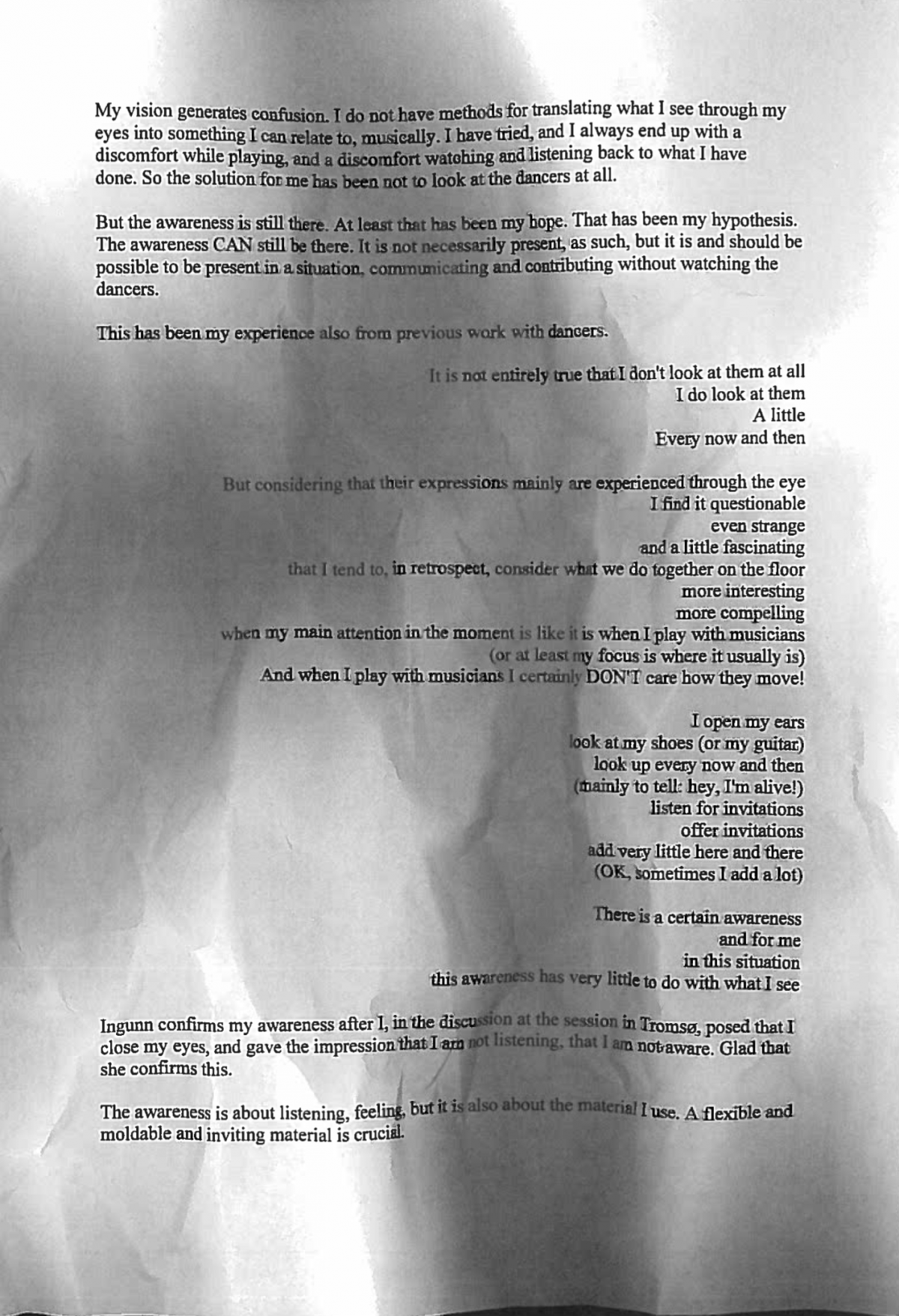 Men hva med blikk? Hvor fester jeg blikket? Hva har jeg kontakt med gjennom blikket? Forsvinnende lite. Skuffende lite, hvis jeg skal vaere helt aerlig. Jeg tenker at jeg burde se mer pa danserne, men jeg har nok med a se pa instrumentet mitt! Dessuten har jeg ikke funnet noen gode svar eller bevis pa at kommunikasjonen blir vesentlig bedre, eller at det kunstneriske uttrykket blir noe mer besnaerende, ved at jeg tar valg basert pa hva jeg ser nar danserne danser. Det hores ut som en frekkere pastand enn det i virkeligheten er. Det handler ikke om at jeg ikke ser noe interessant hos danserne, eller at jeg ikke blir fenget av det de gjor. Det handler om meg. It's not you, it's me! Det handler om at jeg ikke har noe verktoy, eller at jeg ikke har klart a lage meg noe verktoy som omformer detaljrikdommen i det visuelle til noe jeg kan bruke for a lage musikk. Jeg kan selvsagt ga med, ga mot, svare, parere, men jeg tror ikke jeg trenger – eller er tjent med – at jeg har blikket fast festet mot danseren for a oppna dette. Med fare for a fremsta som litt esoterisk: jeg tror jeg oppnar dette gjennom a oppleve energien, kjenne energien, mer enn a se den. Og sa handler det altsa om at jeg trenger a se pa instrumentet mitt nar jeg spiller.